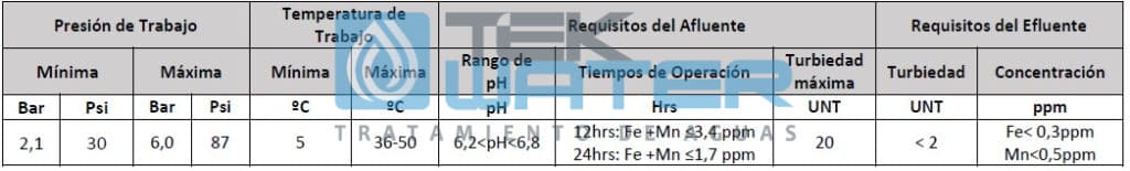 Para un correcto funcionamiento del filtro de hierro/manganeso es importante que el agua cumpla las siguientes condiciones: